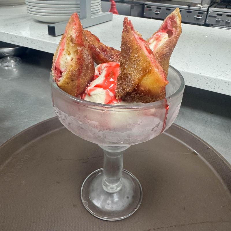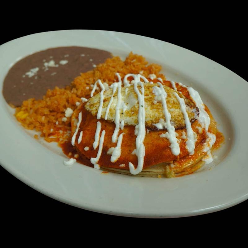 Fajita +$2.00 • A crispy flour tortilla, topped with creamy queso or ranchero sauce. Filled with chicken tinga or ground beef, and jack cheese. Served with rice and beans.
