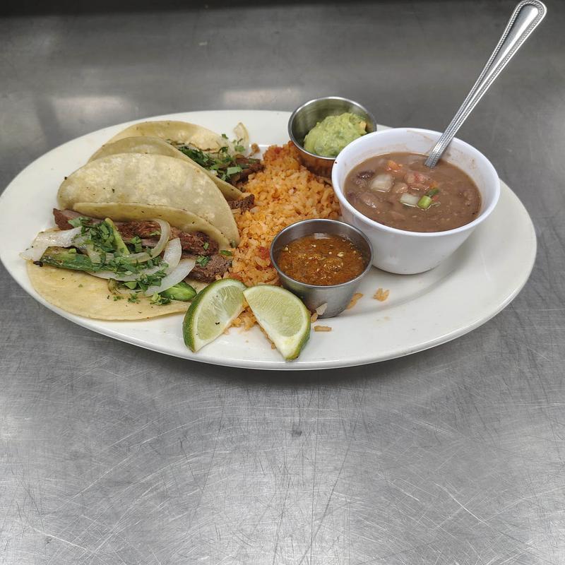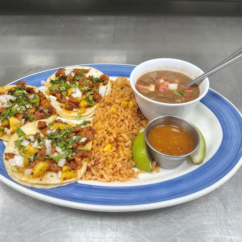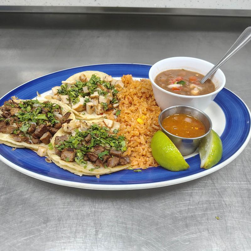 Crispy or soft tacos with shredded chicken tinga or ground beef, topped with lettuce, tomatoes, and mixed cheese. Served with rice and beans.