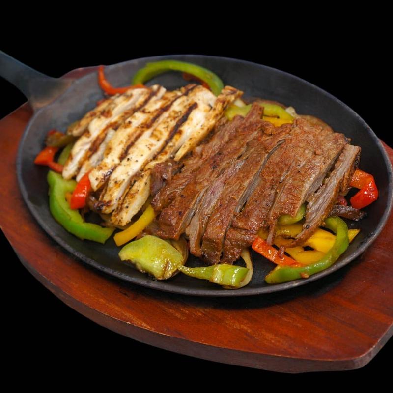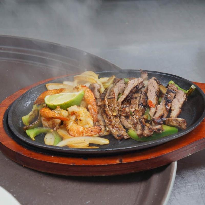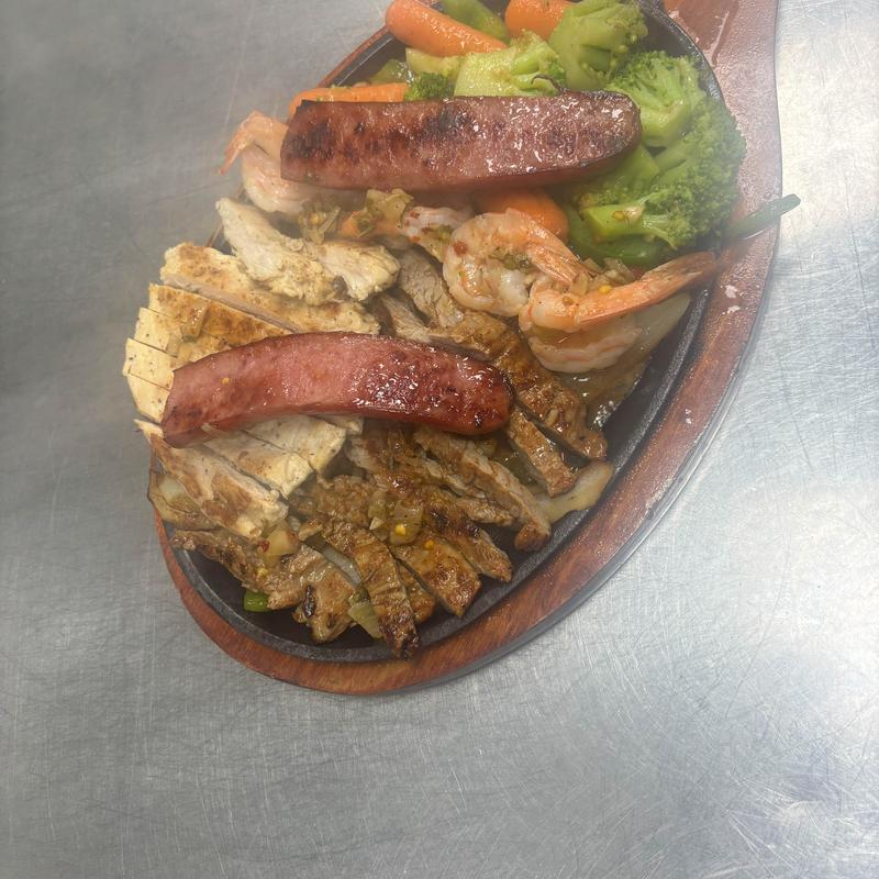 For 1 $20.99 | For 2 $39.99 • Chicken, beef fajita, shrimp, andouille sausage, and sautéed vegetables. With grilled onions, bell peppers, and whole grilled jalapeño.