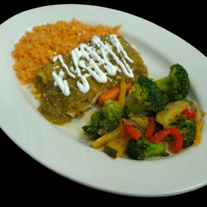 Two shredded chicken enchiladas topped with a delicious green tomatillo sauce and zig-zag sour cream sauce. Served with rice and veggies.