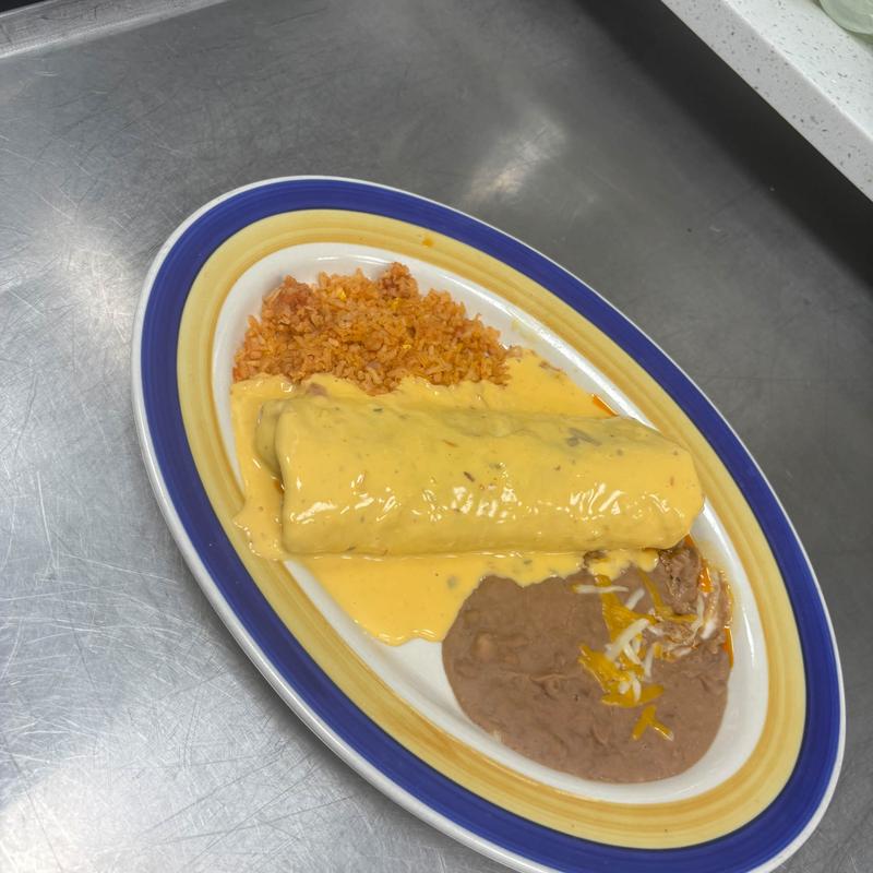A large flour tortilla filled with rice, refried beans, mixed cheese, sour cream, with your choice of fajita chicken or fajita beef. Served with queso and sour cream.