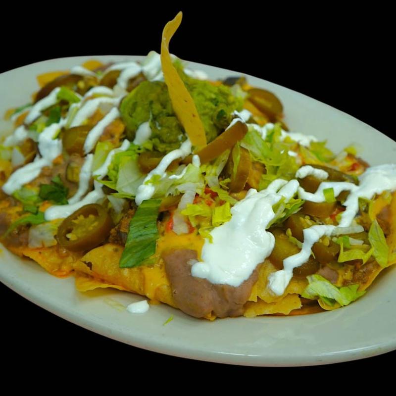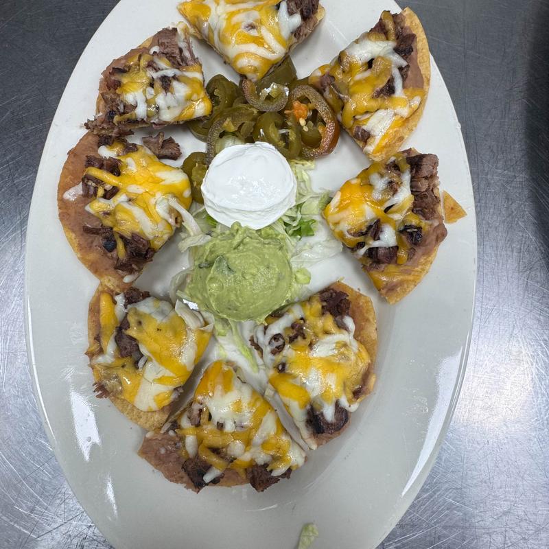 Tinga or Ground Beef | Fajita +$2.00 • 2 round crispy nachos layered with beans, choice of meat and melted cheese. Served with guacamole, sour cream, and jalapeños.