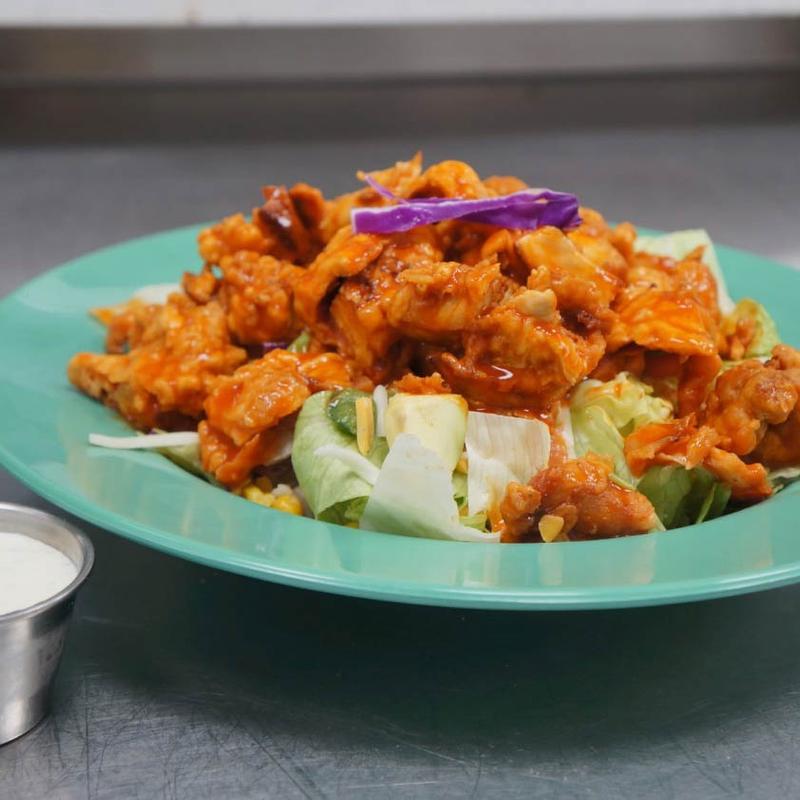 Fresh salad mix, pico de gallo, corn, mixed shredded cheese, and avocado. Tossed with buffalo sauce.
