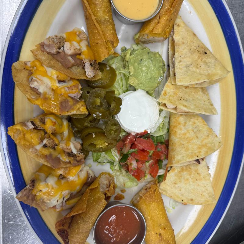 A triple combination of flavors: Chicken flautas, beef or chicken fajita nachos, and chicken quesadillas. Served with guacamole, sour cream, nacho-jalapeños, and chile con queso.