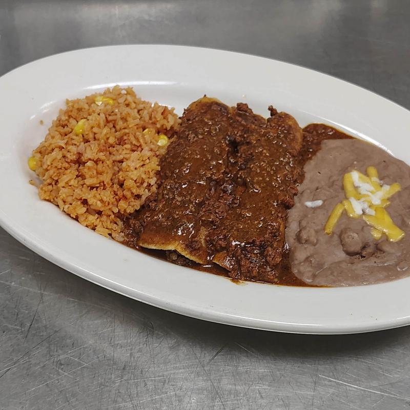 Two pork tamales covered with chile con carne. Served with rice and beans.