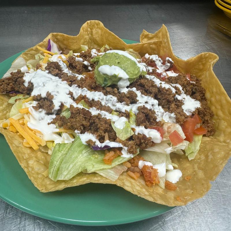 Chicken Tinga or Ground Beef $12.99 • Beef or Chicken Fajita +$2.00 • A crispy flour tortilla bowl with fresh romaine lettuce. Topped with rice, refried beans, tomatoes, mixed cheese, guacamole, and zig-zag sour cream sauce.